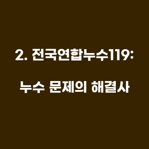 전국연합누수119는 이러한 누수 문제를 전문적으로 해결하는 업체입니다. 오랫동안 누수로 고생해온 고객들에게 특히 추천할 만한 서비스입니다. 이 업체는 최신 장비를 사용하여 누수의 원인을 정확하게 찾아내고, 신속하게 수리 작업을 진행합니다. 또한, 고객의 상황에 맞춘 맞춤형 솔루션을 제공하여, 누수 문제를 근본적으로 해결해 줍니다.